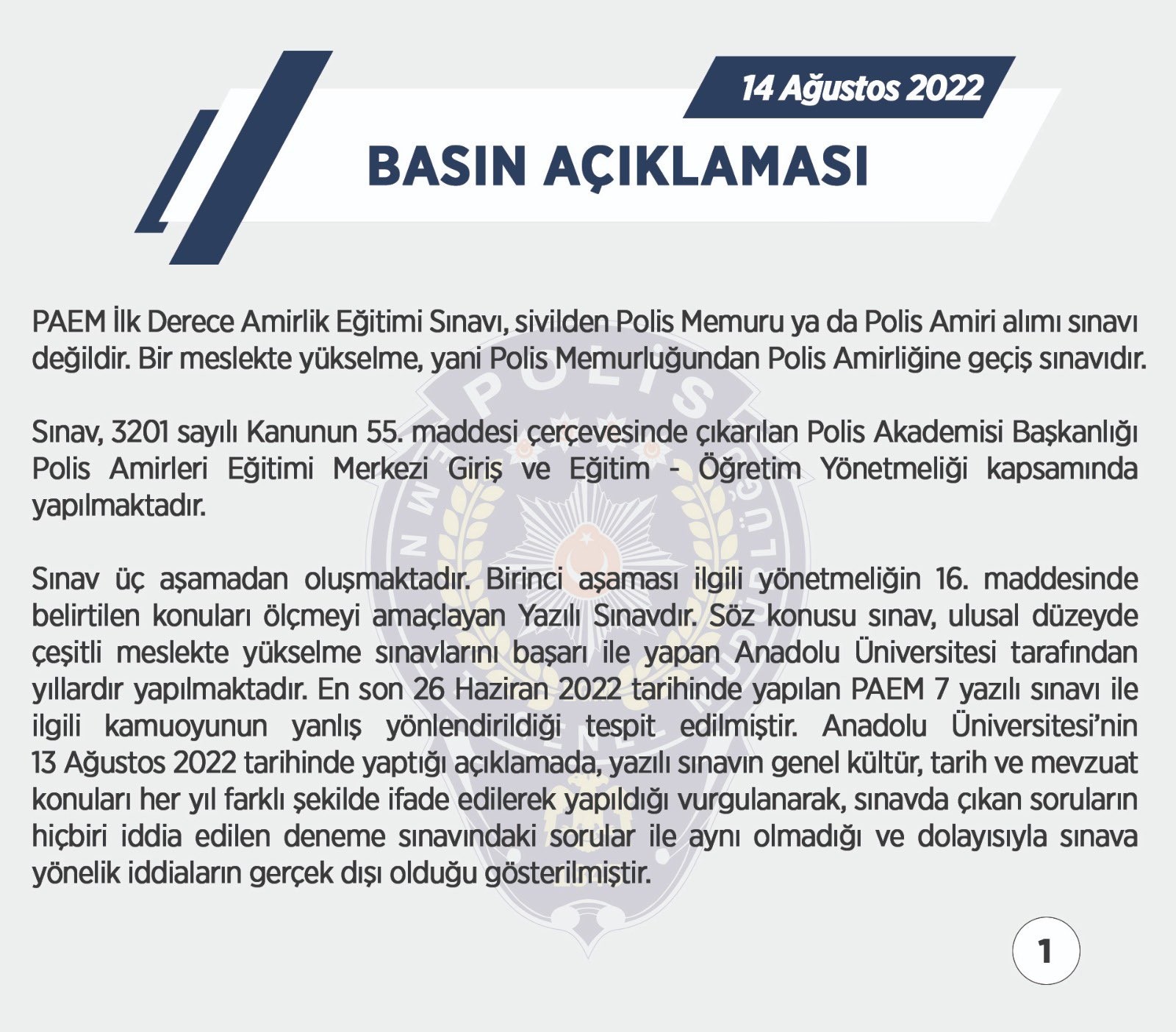 Emniyet Genel Müdürlüğü (EGM), Polis Amirleri Eğitimi Merkezi (PAEM) sınavında sorulan soruların, bir yayının hazırladığı deneme kitapçığındakilerle aynı olduğu yönündeki iddiayı yalanladı.