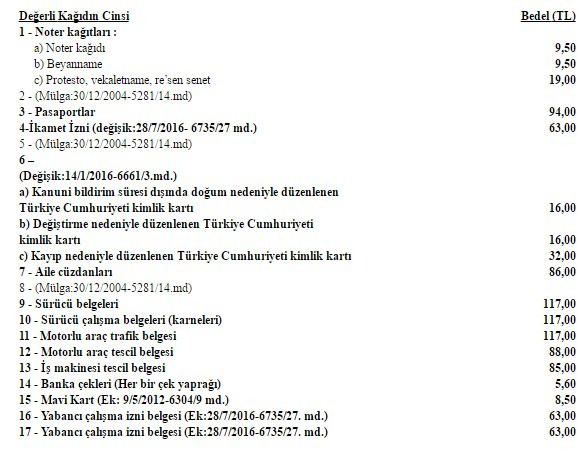Değiştirme nedeniyle verilen TC kimlik kartları için 16 TL, eğer kayıp nedeniyle düzenleniyorsa 32 TL bedel öngörülüyor. Gelecek yıl, noter kağıtları ve beyanname için 9.50 TL, protesto, vekaletname ve re’sen senet için 19 TL, her bir banka çeki yaprağı için ise 5.60 TL bedel ödenecek.