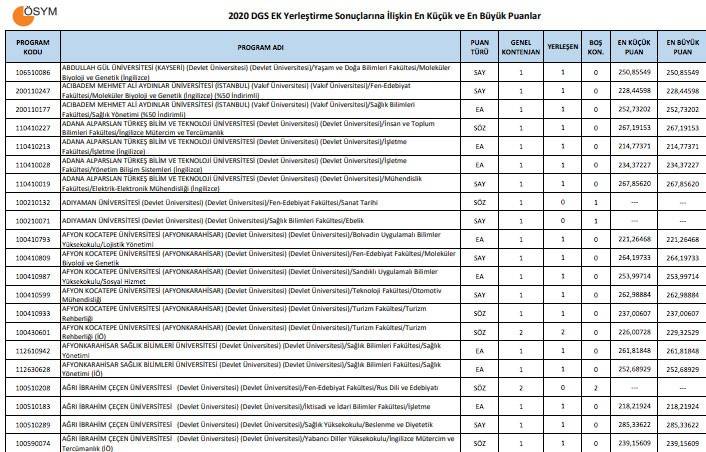 2020 DGS ek yerleştirme kontenjanları listesi için tıklayın