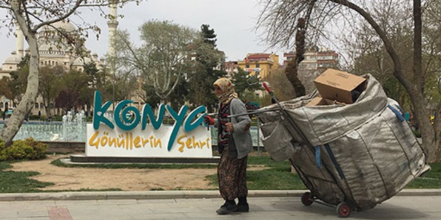 Konya'da, eşi kanser hastası, kendisinin de romatizma ve bel fıtığı rahatsızlığı olan 61 yaşındaki Gül, el arabasıyla günde 12 saat çöp konteynerlerinden topladığı kartonları 15 liraya satarak evinin geçimini sağlıyor.