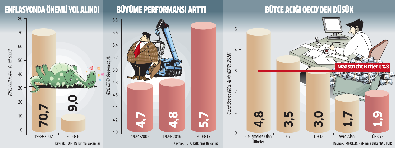 Verilere göre 2002’de yüzde 78 olan kamunun borç yükünün GSMH’ye oranı yüzde 28’e kadar düştü. Türkiye elde ettiği bu oranla öncü ekonomiler arasında en iyi durumda bulunuyor. Almanya’da kamu borcunun milli gelire oranı yüzde 68.3 olurken, bu rakam Fransa’da yüzde 96, İngiltere’de yüzde 89.3 ve İspanya’da yüzde 99.4 seviyesinde. Türkiye bütçe açığında da yüzde 2’nin altını yakalayarak G7 ortalaması olan yüzde 3.5’in altında bulunuyor. Kişi başına geliri 15 yılda iki kat artıran, hiper enflasyonu yüzde 10’lara çekmeyi başaran Türkiye, gelişmiş ülkelerle gelir farkını da hızla kapatmaya başladı.