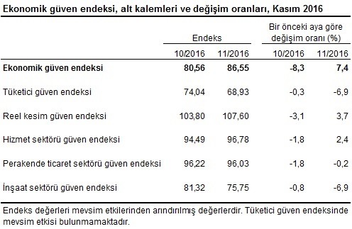 Buna göre, ekonomik güven endeksi Kasım ayında bir önceki aya göre yüzde 7,4 oranında artarak 80,56 değerinden 86,55 değerine yükseldi. Ekonomik güven endeksindeki artış, reel kesim (imalat sanayi) ve hizmet sektörü güven endekslerindeki artışlardan kaynaklandı.