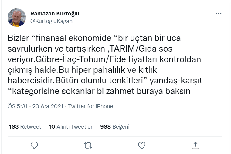 Kurtoğlu yaptığı açıklamada, "Bizler “finansal ekonomide “bir uçtan bir uca savrulurken ve tartışırken, TARIM/Gıda sos veriyor. Gübre-İlaç-Tohum/Fide fiyatları kontroldan çıkmış halde. Bu hiper pahalılık ve kıtlık habercisidir. Bütün olumlu tenkitleri” yandaş-karşıt “kategorisine sokanlar bi zahmet buraya baksın" ifadelerini kullandı.
