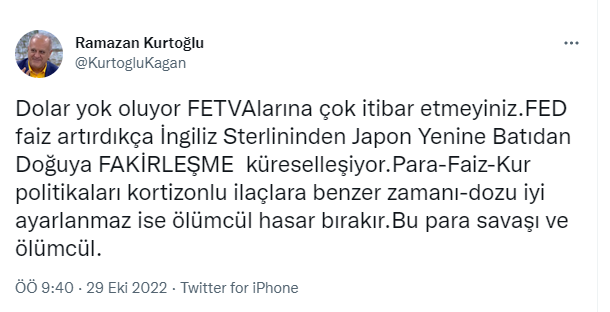 Kurtoğlu yaptığı açıklamada, "Dolar yok oluyor fetvalarına çok itibar etmeyiniz. FED faiz artırdıkça İngiliz Sterlininden Japon Yenine Batıdan Doğuya fakirleşme küreselleşiyor. Para-Faiz-Kur politikaları kortizonlu ilaçlara benzer zamanı-dozu iyi ayarlanmaz ise ölümcül hasar bırakır. Bu para savaşı ve ölümcül" dedi.
