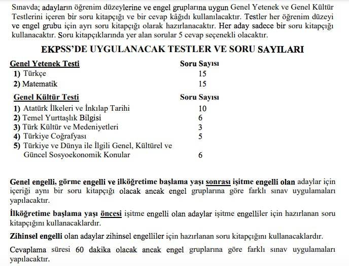 Sınavda adaylara engel gruplarına ve öğrenim düzeylerine uygun Genel Yetenek ve Genel Kültür Testleri uygulanacaktır. Testlerde toplam 60 soru bulunacak ve sınav süresi 60 dakika olacaktır. Adayların engel gruplarına ve öğrenim düzeylerine uygun hazırlanmış testler, adayların engel durumlarına göre sınav uygulamaları ile gerçekleştirilecektir.