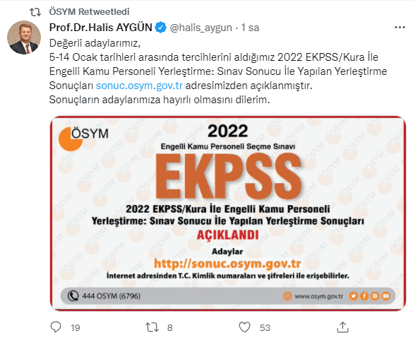 ÖSYM Başkanı Prof. Dr. Halis Aygün, sosyal medya hesabındaki paylaşımda, şu bilgileri verdi: