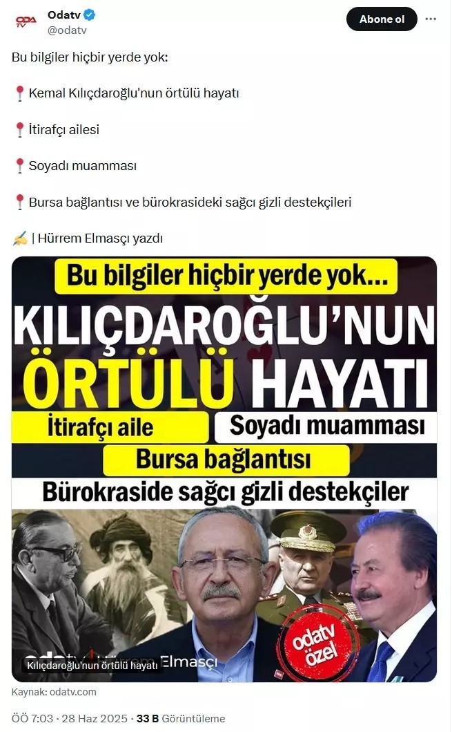 “Bu bilgiler hiçbir yerde yok” ifadesiyle sunulan haberde “Kemal Kılıçdaroğlu'nun örtülü hayatı”, “İtirafçı ailesi”, “Soyadı muamması” gibi başlıklar yer aldı.