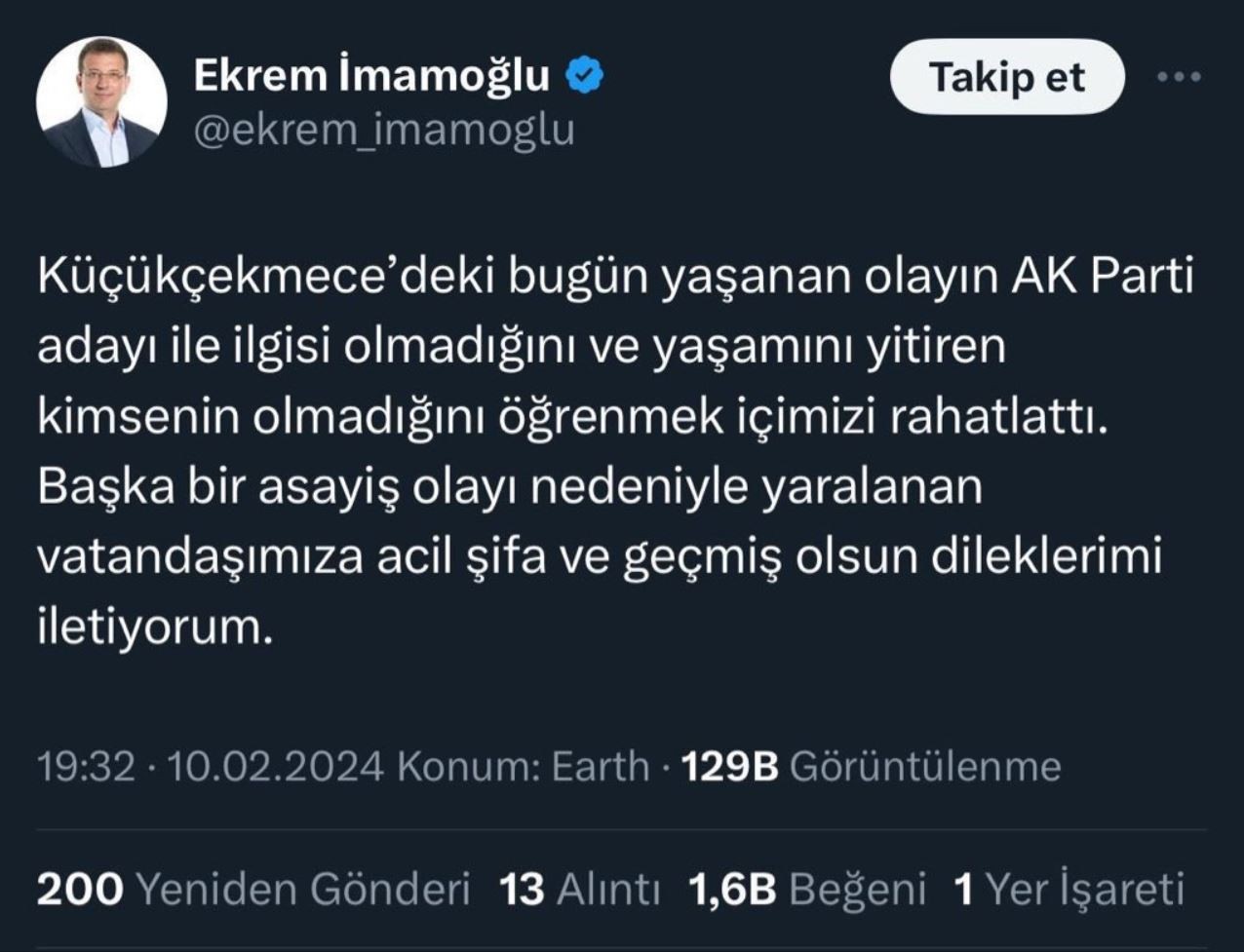İstanbul'da AK Parti Küçükçekmece Belediye Başkan adayı Sayın Aziz Yeniay'ın Kanarya Mahallesi'ndeki aday tanıtım etkinliğine düzenlenen kalleş saldırıya ilişkin olarak İBB Başkanı Ekrem İmamoğlu'nun paylaştığı mesaj büyük tepki çekti.