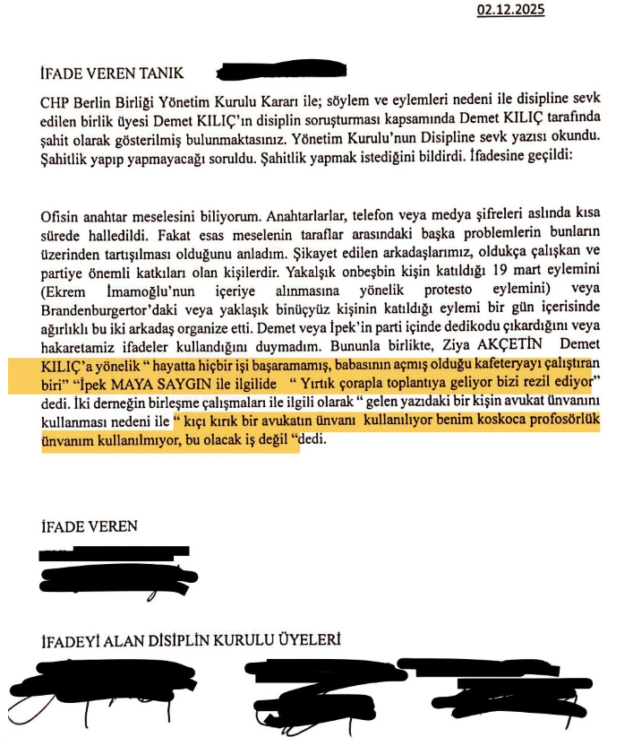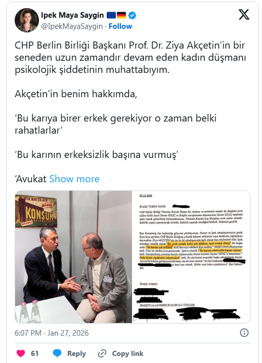 CHP Berlin Birliği Yönetim Kurulu Üyesi ve Avukat İpek Maya Saygın, Genel Başkan Özgür Özel’e yakınlığıyla bilinen Birlik Başkanı Prof. Dr. Ziya Akçetin tarafından sistemli bir psikolojik şiddete maruz kaldığını açıkladı.