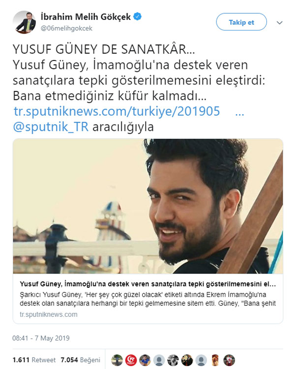 "Yusuf Güney de sanatkar" diyen Gökçek'in paylaşımı binlerce kullanıcı tarafından paylaşıldı.
