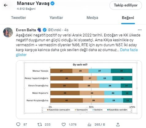 Mansur Yavaş beğendiği tweette, ‘’Aşağıdaki negatif/pozitif oy verisi Aralık 2022 tarihli. Erdoğan ve KK ülkede negatif duygunun en güçlü olduğu iki siyasetçi. Ama KKya kesinlikle oy vermezdim + vermezdim diyenler %66, RTE için aynı durum %57. İki aday karşı karşıya kalınca daha çok sevilen değil daha az olumsuz duygu beslenen kazandı. İki adaylı seçimlerin doğası bu. Aday önemli, bu kadar basit, bu kadar açık…’’ ifadeleri bulunuyor.
