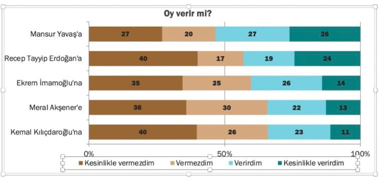Tweet’in altında ise Aralık 2022 tarihli bir anketin grafiği yer almakta. Bu grafiğe göre vatandaşların ‘’Kesinlikle oy vermem’’ sorusunda en düşük oran Mansur Yavaş’ın olurken, ‘’Kesinlikle oy veririm’’ sorusunda da en yüksek oran Mansur Yavaş’ın oldu.