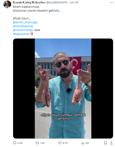 Keleş, Saraçhane'de bulunan İBB binasının önünde çektiği görüntüyü "Ekrem başkanımıza; Müslüman olarak hissesini getirdik... Afiyet olsun..." notuyla paylaştı.