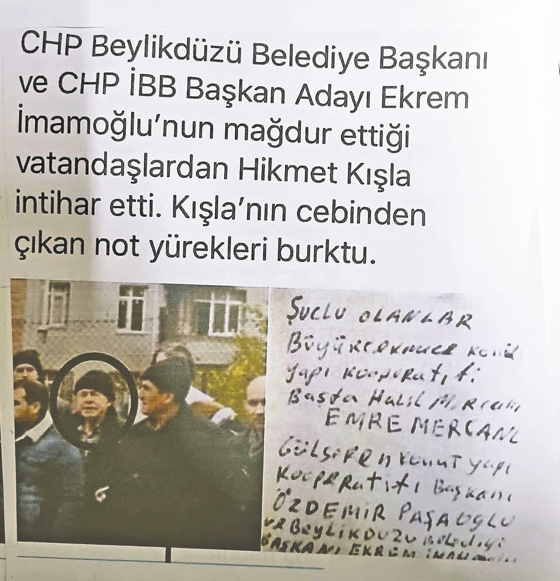 Ekrem İmamoğlu’nun Beylikdüzü Belediye Başkanı olduğu dönemde, kayıp 160 bin TL yüzünden yoğun bir baskı ve mobinge maruz kalan ve sonrasında intihar eden İmam Hatip Lisesi mezunu veznedar Yaşar Uçar dosyasında, 5 yılda 8 kez savcısı değişmesine rağmen henüz olayın iddianamesinin bile hazırlanmadığı anlaşılmıştı. Son olarak Ekrem İmamoğlu’nun Beylikdüzü Belediye Başkanlığı döneminde tapularını vermediği kooperatif mağdurlarından Hikmet Kışla’nın da, “Suçlu İmamoğlu” notu bırakarak intihar ettiği ortaya çıktı.