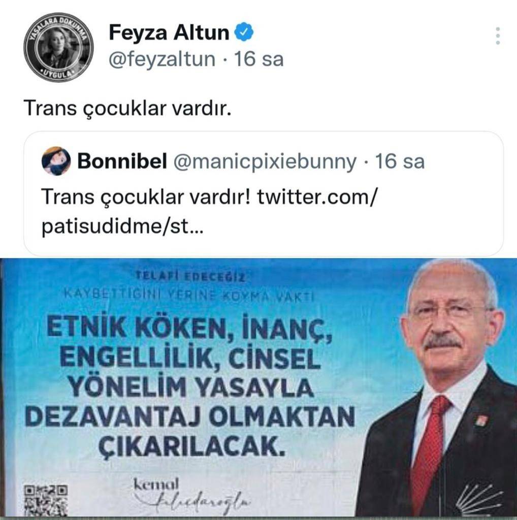 Özellikle CHP Şişli, CHP Beşiktaş ve CHP Kadıköy’ün başını çektiği CHP’li belediyelerin LGBT’nin sözde onur yürüyüşlerine verdiği destek toplumdan büyük tepki görmesine rağmen sürüyor. ‘Trans Çocuklar Vardır’ paylaşımıyla zihin yapısını ortaya koyan CHP’li Feyza Altun gibi CHP Lideri Kemal Kılıçdaroğlu da billboardlardaki görsellerde cinsel yönelimi yasayla koruma altına alacaklarını ifade ederek LGBT’nin ve eşcinsel evliliklerin önünü açacaklarını itiraf etti.