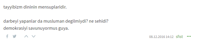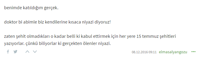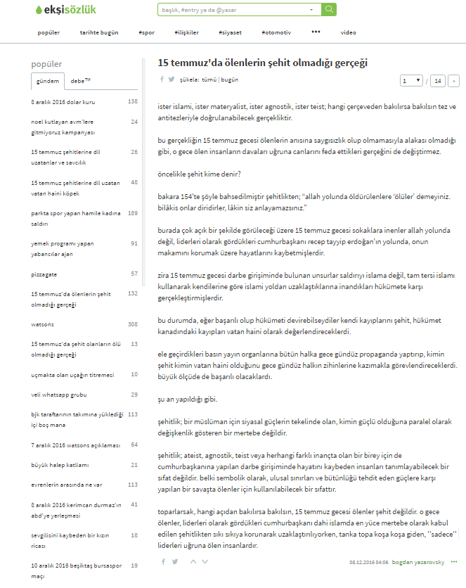Başlığı açan ve muhtemelen bilgisayar IP’si belli olan ‘bogdan yazarovsky’ isimli yazar 15 Temmuz gecesi FETÖ’cü hainler ile birlikte karanlık güçlerin ülkemizi işgal etmesine karşı koyan ve o esnada şehit düşen kahramanların ‘aslında şehit olmadığını’ savundu. Alçak yazar bunu şu ifadeler ile savundu: Burada çok açık bir şekilde görüleceği üzere 15 Temmuz gecesi sokaklara inenler Allah yolunda değil, liderleri olarak gördükleri Cumhurbaşkanı Recep Tayyip Erdoğan'ın yolunda, onun makamını korumak üzere hayatlarını kaybetmişlerdir.’