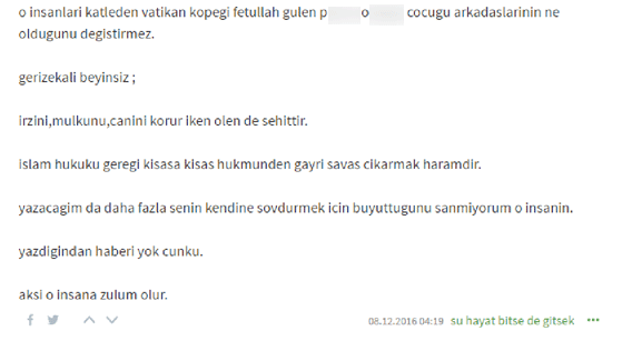 Ey ekşi sözlük yazarlarının büyük kısmı sizin almayacağınız bazı değerler vardır. Vatanını ve namusunu savunmak Müslümanların farzıdır… Yani vatan müdafaası Allah tarafından emredilmiştir! Bu nedenle vatanı savunmak İslam’ın gereğidir. Bu nedenle ‘Vatanını savunan, dinini savunmuş olur.’ Yani sizin o kıt beyinlerinizin bunu anlamaması çok normal. Şayet, sizden böyle bir şeyi anlamanızı da uygulamanızı da bekleyen yok. Fakat sıkıntı ne biliyor musunuz sizin adice, şerefsizce, alçakça insanların değerlerine saldırmanız. Aynı şeyin çok küçük bir ölçeği sizin için yapıldığı zaman (örneğin sizin değiminiz ile homofobik insanlar) çok büyük yaygaralar kopararak süslü cümleler kullanmasını çok iyi biliyorsunuz. Fakat artık size tahammül etmek istemiyoruz. Üstelik vicdanların kaldıramayacağı çok daha ağır ifadeler kullanılan mesajlar da bulunuyordu. Bunları buradan yayınlamıyoruz.