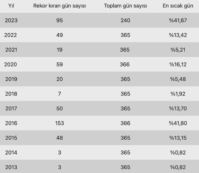 Kurnaz'ın verdiği bilgilere göre, her günün geçmiş yıllardaki aynı güne ait sıcaklık değeriyle kıyaslandığı hesaplamada, sıcaklık rekoru kırılan gün sayısı, 2013'ten bu yana aşağıdaki gibi gerçekleşti: