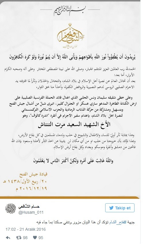 Haberde, Fetih Ordusu'nun suikastı üstlendiğini açıkladığı sözde bildirinin görüntüsüne de yer verilmişti.