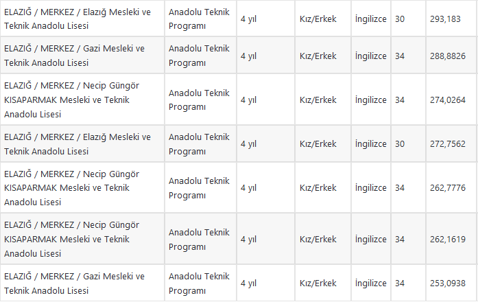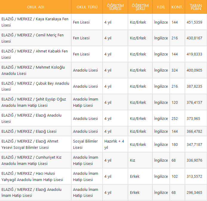 Elazığ liseleri taban puanı 2021, Elazığ liseleri başarı sıralaması ve liseleri kontenjanları nelerdir?