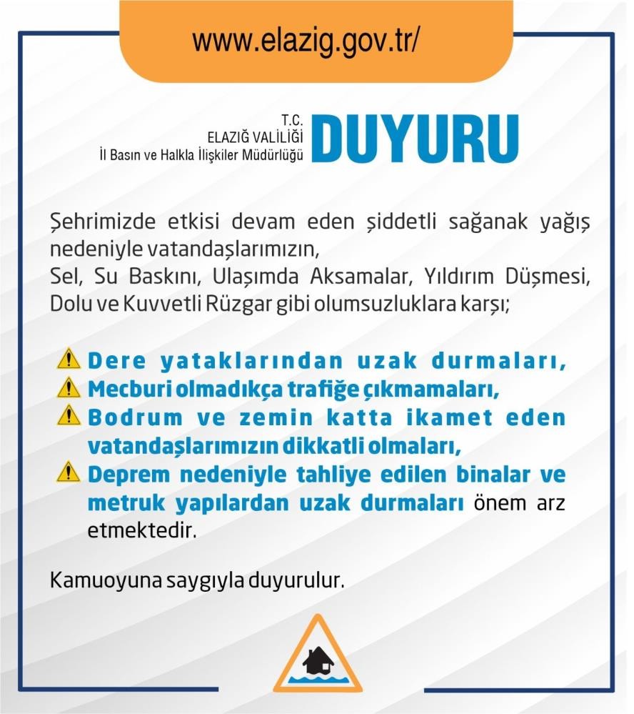 Elazığ Valiliği’nden yapılan açıklamada, "Şehrimizde etkisi devam eden şiddetli sağanak yağış nedeniyle vatandaşlarımızın, sel, su, baskını, ulaşımda aksamalar, yıldırım düşmesi, dolu ve kuvvetli rüzgar gibi olumsuzluklara karşı, dere yataklarından uzak durmaları, mecburi olmadıkça trafiğe çıkmamaları, bodrum ve zemin katta ikamet eden vatandaşlarımızın dikkatli olmaları, deprem nedeniyle tahliye edilen binalar ve metruk yapılardan uzak durmaları önem arz etmektedir" denildi.
