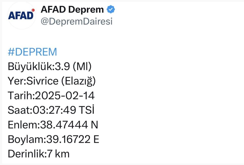 Afet ve Acil Durum Yönetimi Başkanlığı Deprem Dairesi Başkanlığından alınan bilgiye göre, saat 03:27’de merkez üssü Elazığ'ın Sivrice ilçesinde 3.9 büyüklüğünde deprem meydana geldi. Yerin yaklaşık 7 kilometre derinliğinde meydana gelen depremle ilgili olumsuz bir durum yaşanmadığı öğrenildi.