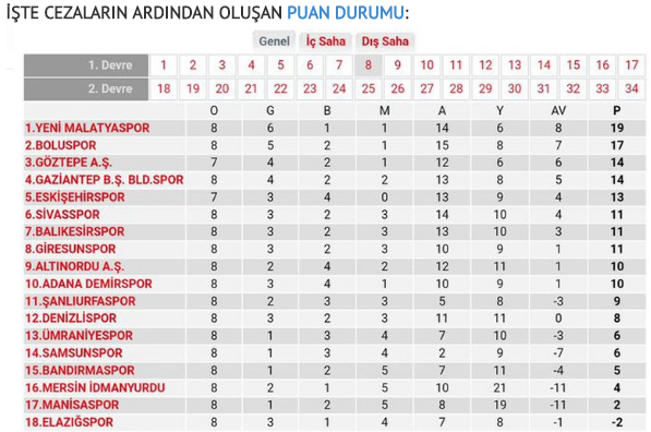 FIFA TFF 1.Lig ekiplerinden Elazığspor'un 12 puanını sildi. Cezadan önce 10 puanı bulunan Elazığspor -2 puana inerek son sırada yer aldı.