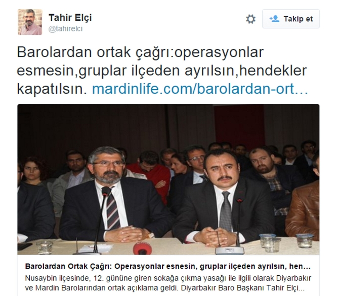 Diyarbakır Baro Başkanı Tahir Elçi'nin son günlerde yaptığı paylaşımlar ise dikkat çekti. PKK'lı grupların bölgeden ayrılmasını isteyen Elçi, hendeklerin kapatılması gerektiğini söyleyerek konuyla ilgili tweetler atmıştı.