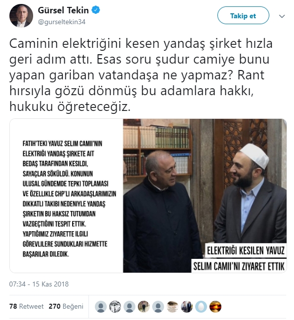 Sosyal medyadan açıklamada bulunan Gürsel Tekin, "Caminin elektriğini kesen yandaş şirket hızla geri adım attı. Esas soru şudur camiye bunu yapan gariban vatandaşa ne yapmaz? Rant hırsıyla gözü dönmüş bu adamlara hakkı, hukuku öğreteceğiz." ifadesinde bulundu.