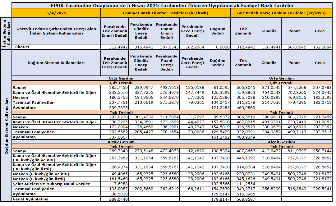 Elektrik Zammı Oranları (4 Nisan 2026 itibarıyla)