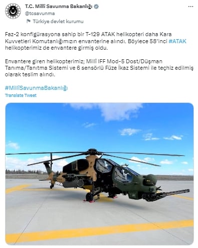 Milli Savunma Bakanlığı tarafından yapılan açıklamada, "Faz-2 konfigürasyona sahip bir T-129 ATAK helikopteri daha Kara Kuvvetleri Komutanlığı envanterine alındı. Böylece TSK’nın 58’inci ATAK helikopteri de envantere girmiş oldu. Envantere giren helikopter; Millî IFF Mod-5 Dost/Düşman Tanıma/Tanıtma Sistemi ve 6 sensörlü Füze İkaz Sistemi ile teçhiz edilmiş olarak teslim alındı" ifadelerine yer verildi.