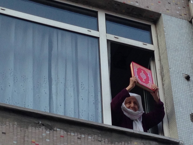 Mavi Marmara'nın 5. yılı vesilesiyle İHH tarafından organize edilen 'Özgür Kudüs Yürüyüşü'ne katılan Müslümanlar, yürüyüş esnasında evinin penceresinden elinde Kur'an-ı Kerim ile kendilerini selamlayan bir teyzeyi hayranlıkla izledi.