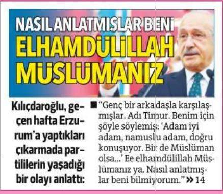 Kendisinin insanlara yanlış tanıtıldığını iddia eden Kılıçdaroğlu, "Erzurum’da genç bir kardeşimiz vardı adı Timur. Benim için 'İyi adam, namuslu adam ama bir de Müslüman olsa' demiş. Elhamdülillah Müslümanız. Allah’ımız bir, kitabımız bir, peygamberimiz bir. Nasıl anlatmışlar beni bilemiyorum" diye konuştu.