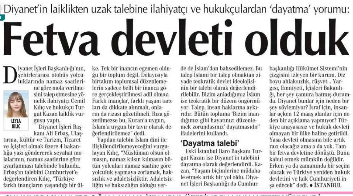Sözde ilahiyatçı ve hukukçuların yorumlarına yer veren solak Cumhuriyet, Diyanet'in talebinin laikliğe bir saldırı olduğu hezeyanında bulundu.