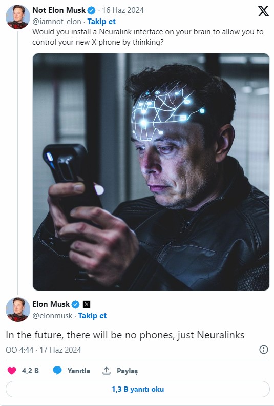 Musk, eski adı Twitter olan X'te "Yeni X telefonunuzu düşünerek kontrol etmenizi sağlamak için beyninize bir Neuralink arayüzü takar mıydınız?" diye soran bir parodi hesabına yanıt verdi.