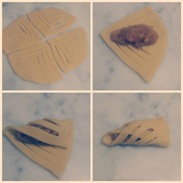 Un dışındaki malzemeleri karıştırın. Unu ekleyerek hamur haline getirin. 20 dk dinlendirin. Ardından 4 parçaya ayırıp yuvarlak şekilde açın. Fotoğrafta olduğu gibi hazırlayıp tepsiye dizin. 180 derecede kızarana kadar pişirin.