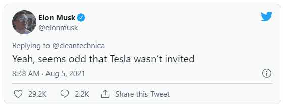 Tesla CEO’su Elon Musk, bu durumu Perşembe günü (bugün) attığı bir tweet ile duyurdu. Gazeteciler konuyla alakalı bilgi almak için bir Beyaz Saray sözcüsüne ulaşmaya çalışsa da çabaları boşa çıktı. Otomobil üreticileri, elektrikli otomobil pazarında Tesla’nın sahip olduğu payı tırtıklamaya başlamış olsalar da pazarda söz sahibi olan şirket hâlâ Tesla. Bu denli öncü bir şirketin, Beyaz Saray tarafından düzenlenen bir zirveye davet edilmemesi hayret verici bir durum.