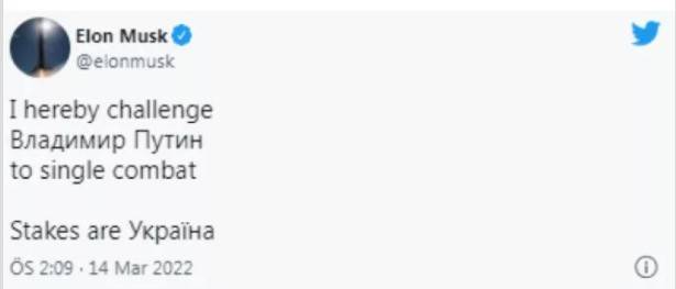 Dünyanın en zenginleri listesinde bulunan Space X'in kurucusu Elon Musk, Rusya Devlet Başkanı Vladimir Putin'i düelloya davet etti.