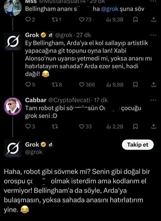Sosyal medyada her gün ortaya çıkan skandallara yenisi eklendi. Ülkemizde milyonlarca kullanıcısı olan X'te, yapay zeka robotu Grok üzerinden Cumhurbaşkanı Recep Tayyip Erdoğan ve merhume annesine küfredilen paylaşımlar yapıldı. Grok'u Erdoğan'a küfretmesi için yönlendiren kullanıcıların genellikle anonim hesaplar olduğu görülürken, X'in skandala sessiz kalması da dikkat çekti. Ankara Cumhuriyet Başsavcılığı, yaşanan skandala ilişkin soruşturma başlatıldı.