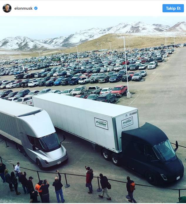 Tesla, 2019 yılına kadar Semi ismindeki TIR’ını üretmeyi düşünmüyor. Fakat gelen siparişler neticesinde test tırlarını yollara çıkartmak zorunda kalan Tesla, iki adet Semi’yi yollara çıkarttı. Elon Musk’ın kendi Instagram hesabı üzerinden duyurduğu bu haberde kamyonların Nevada’da bulunan Gigafactory’den, Fremont California’daki Tesla’nın üretim tesisine araç aküleri taşıdı.
