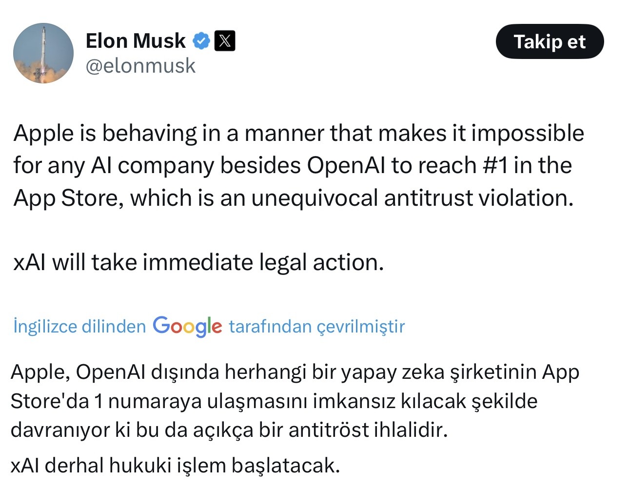 X hesabından yaptığı paylaşımda Musk, Apple’ın OpenAI’ye haksız avantaj sağladığını öne sürdü. Bu durumun rakipler için adil olmadığını ve tekelleşme yarattığını savunan Musk, “Gerekirse dava açarım” resti çekti.