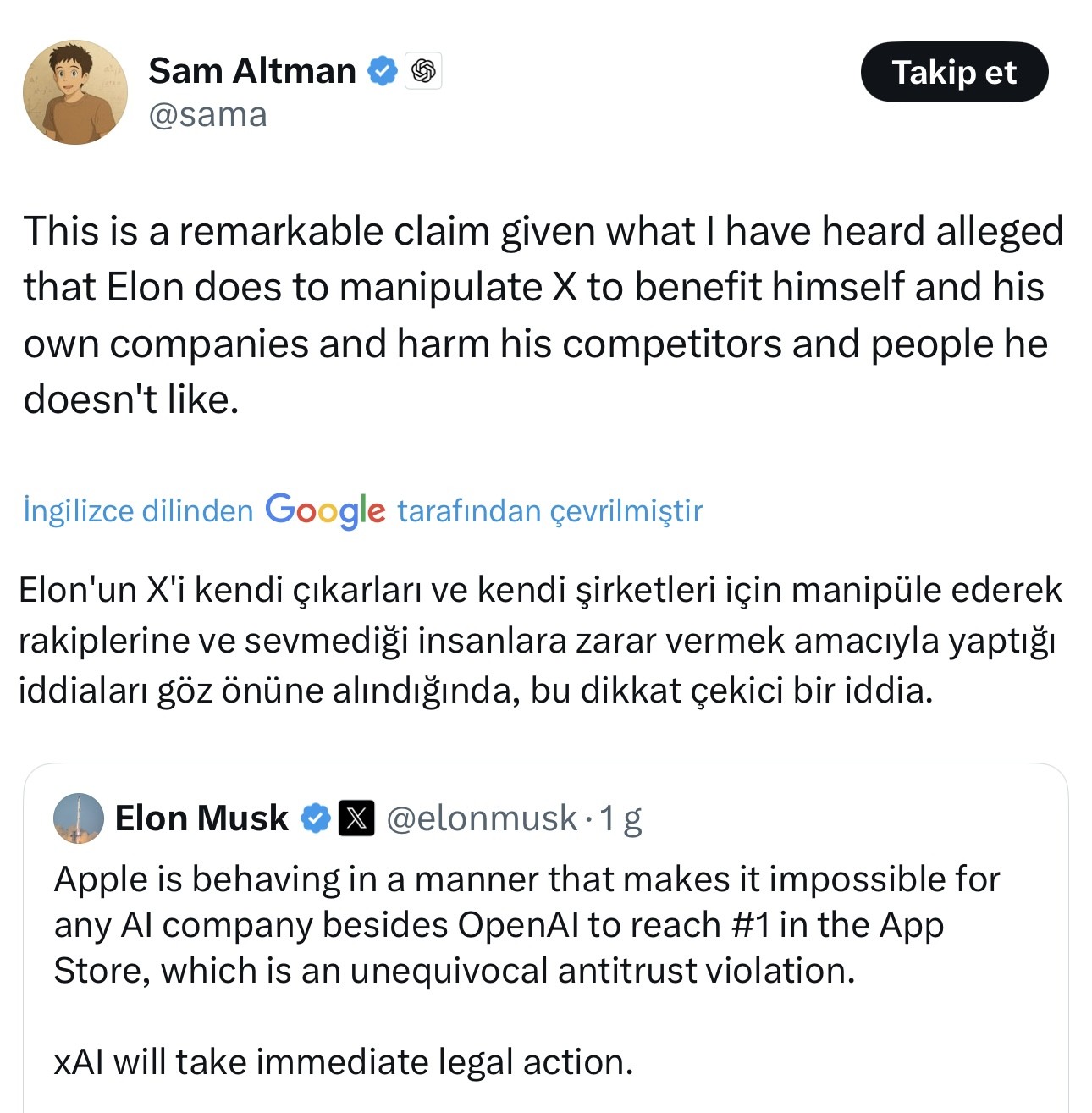 Açıklama sonrası topu eline alan OpenAI CEO’su Sam Altman ise Musk’ı sert sözlerle hedef aldı: “X platformunu kendi çıkarları için manipüle ediyor, rakiplerine zarar veriyor.”