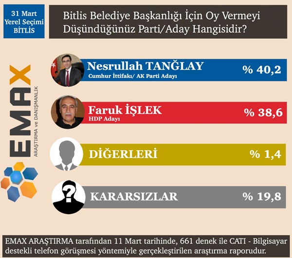 Bitlis’te araştırmaya katılanların yüzde 40,2’si 31 Mart'ta tercihini AK Parti adayı Nesrullah Tanğlay’dan yana kullanacağını belirtirken, yüzde 38,6’sı HDP adayı Faruk İşlek’e oy vereceği yönünde görüş bildirdi. Aynı ankette diğerlerine yüzde 1,4 ve hangisine oy vereceği konusunda kararsız olduğunu belirtenlerin oranı da yüzde 19,8 olarak belirlendi.
