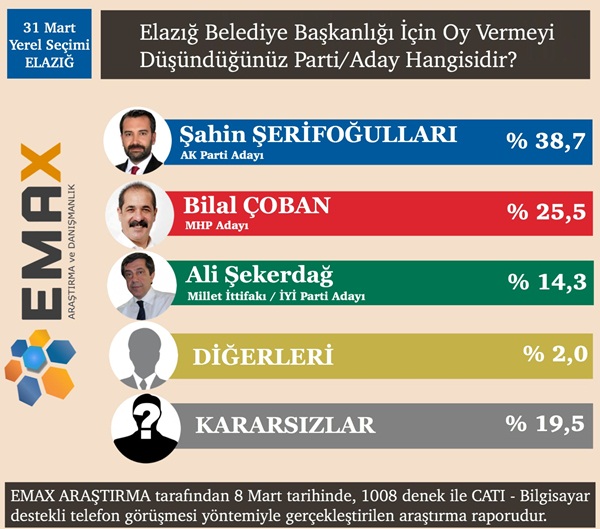 Elazığ'da araştırmaya katılanların yüzde 38,7’si 31 Mart'ta tercihini AK Parti adayı Şahin Şerifoğulları'ndan yana kullanacağını belirtirken, yüzde 25,5’i MHP adayı Bilal Çoban’a oy vereceği yönünde görüş bildirdi. Aynı ankette İYİ Parti adayı Ali Şekerdağ’a yüzde 14,3 diğerlerine yüzde 2 ve hangisine oy vereceği konusunda kararsız olduğunu belirtenlerin oranı da yüzde 19,5 olarak belirlendi.