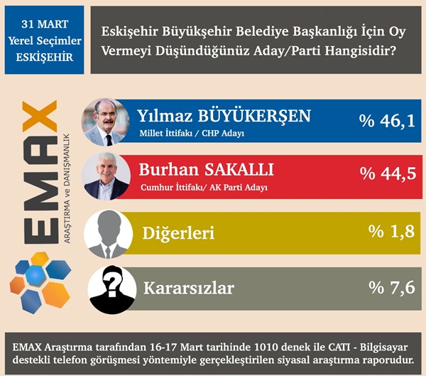 CHP’nin Eskişehir Büyükşehir Belediye Başkan Adayı Yılmaz Büyükerşen’in yüzde 46.1, AK Parti’nin adayı Burhan Sakallı’nın ise yüzde 44.5 oy alacağı öngörüldü.