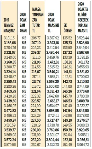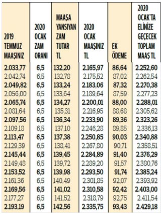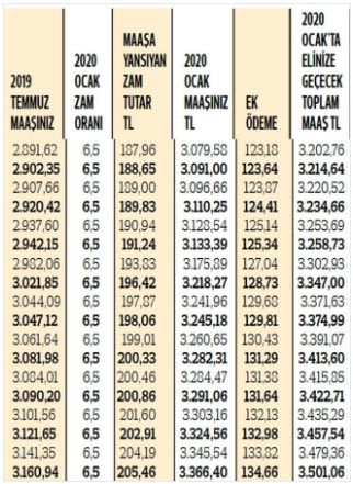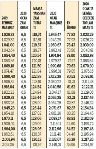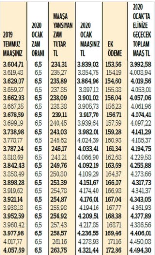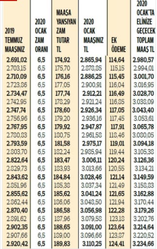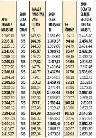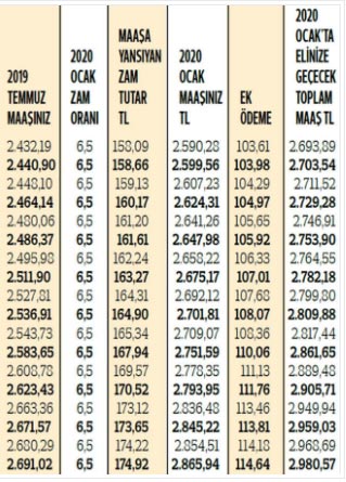 Memur, SSK’lı ve Bağ-Kurlu emekliler ile görevdeki memurların yeni yıl maaş zamları için bekledikleri enflasyon rakamı açıklandı. 2019’un son 6 aylık enflasyonu yüzde 6,5 oldu. Emeklilerin ne kadar zam alacağını Hürriyet'ten Noyan Doğan tek tek yazdı. İşte Noyan Doğan’ın Hürriyet’teki emekli maaşlarına ilişkin yazısının detayları. Zamla birlikte yeni senenin ilk 6 ayında en düşük SSK emeklisinin aylığı 2 bin 111,8 liraya, en düşük Bağ-Kur emeklisinin aylığı bin 889.3 liraya, en düşük tarım emeklisinin maaşı da bin 433 liraya yükselecek. 2019’un Ocak ayında ise SSK, Bağ-Kur ve tarım emeklileri maaşlarını yüzde 10,19 zamlı almıştı. Temmuz ayı zammı ile birlikte 2019 yılı zam toplamı yüzde 15,2 oldu. 2018 de ise emekliler, ocak ayında yüzde 5,69, temmuz ayında ise yüzde 9,17 zamlı almışlar, böylece 2018 yılında toplam yüzde 14,86 zam yapılmıştı.