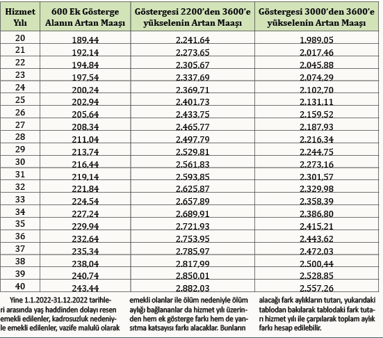 Bunların artan maaşları hizmet yıllarına bağlı aylık bağlama oranlarına göre değişiklik gösterdiğinde 20 ile 35 hizmet yılına göre oluşturduğumuz ilave maaş farkını bir tablo halinde okurlarımıza sunmanın isabetli olacağını değerlendirmekteyim.