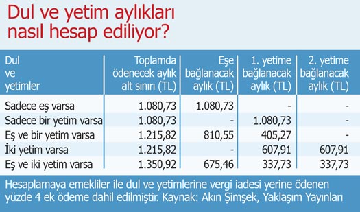 Alt sınır aylığının bir veya iki hak sahibi dul ve yetime ödenmesi gerekirse hesaplanan tutarların dul ve yetimlere ödenmesi gereken tutarın tamamı oranlama suretiyle dul ve yetimlere dağıtılıyor.