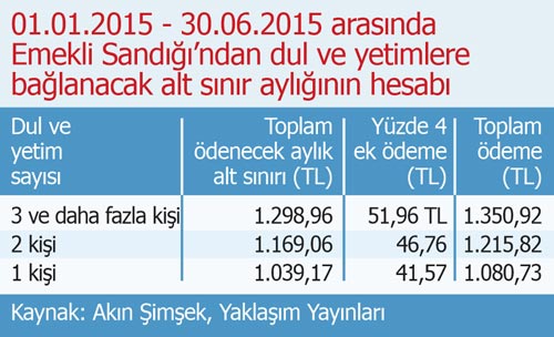 Emekli Sandığı’na tabi çalışırken veya emekli iken vefat edenlerin hak sahibi dul ve yetimlerine ödenecek aylıkların alt sınırı, emekli veya malûllere ödenecek alt sınır aylığının; Dul ve yetim sayısı 3 ve daha fazla ise tamamından, Dul ve yetim sayısı 2 kişi ise yüzde 90’ından, Dul ve yetim sayısı 1 kişi ise yüzde 80’inden az olamıyor.