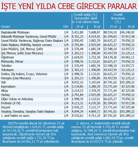 Sosyal güvenlik uzmanı Cem Kılıç'ın köşesine taşıdığı, Kıdem tazminatı tavanı kaç lira oluyor?, Emekli aylığınızı nasıl hesaplayacaksınız?, Dul ve yetimlerin zamları ne kadar? şeklinde sorulara cevap verdiği o yazısı... Bu nedenle memurların emekliliklerinde bazı tarihlere dikkat etmek gerekir. Biz de bugün bu farklılığın nedeni ile birlikte yeni yılda emekli olacak memurların emekli ikramiyelerini ve aylıklarını değerlendireceğiz. Yeni yılda emekli olacak memurların emekli aylıkları ve ikramiyeleri aşağıdaki geniş tablomuzdaki gibi değişecek.BAZI TARİHLERE DİKKAT
